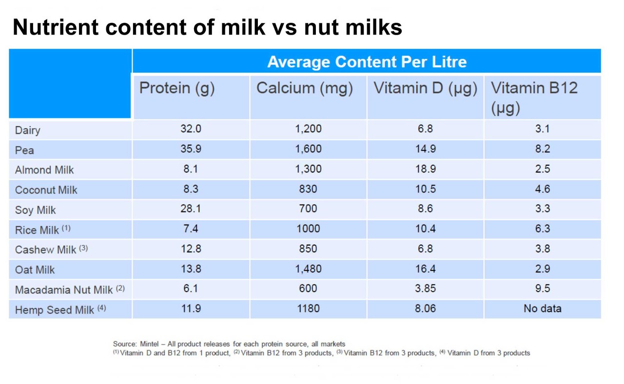 Compared with cow's milk, the nutrient content of protein is often much lower and the cost of those nutrients much higher in plant-based beverages. This is particularly true for nut and oat ‘milks’ – when compared with cow's milk’s 6 cents per gram of protein, almond milk costs on average of 56 cents per gram.