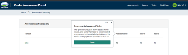 1. Assessments, Issues and Tasks: The queue displays all active assessments, issues, and tasks that need to be completed. You can see further details by clicking on the vendor or engagement you wish to work on.