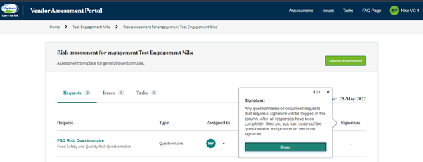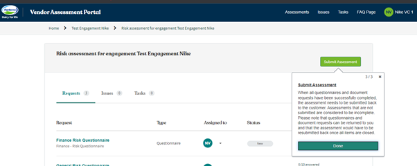 3. Submit Assessment: When all questionnaires and document requests have been successfully completed, the assessment needs to be submitted back to Fonterra. Assessments that are not submitted are considered to be incomplete. Please note that questionnaires and document requests can be returned to you and that the assessment would have to be resubmitted back once all items are closed.