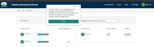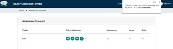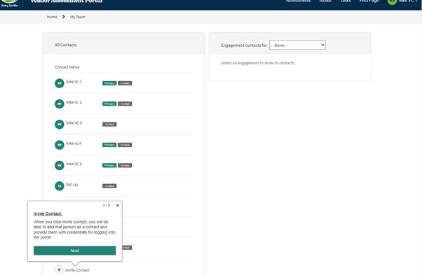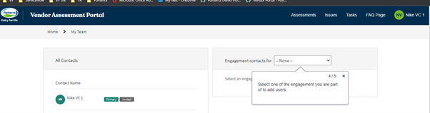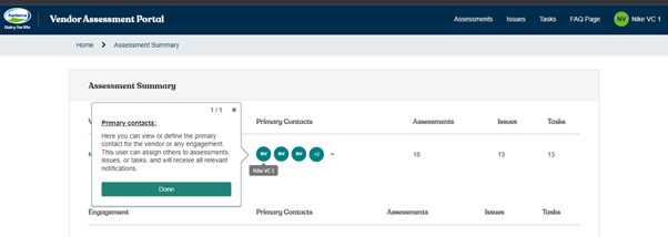 1. Primary contacts: Here you can view or define the primary contact for the vendor or any engagement. This user can assign others to assessments, issues, or tasks, and will receive all relevant notifications.